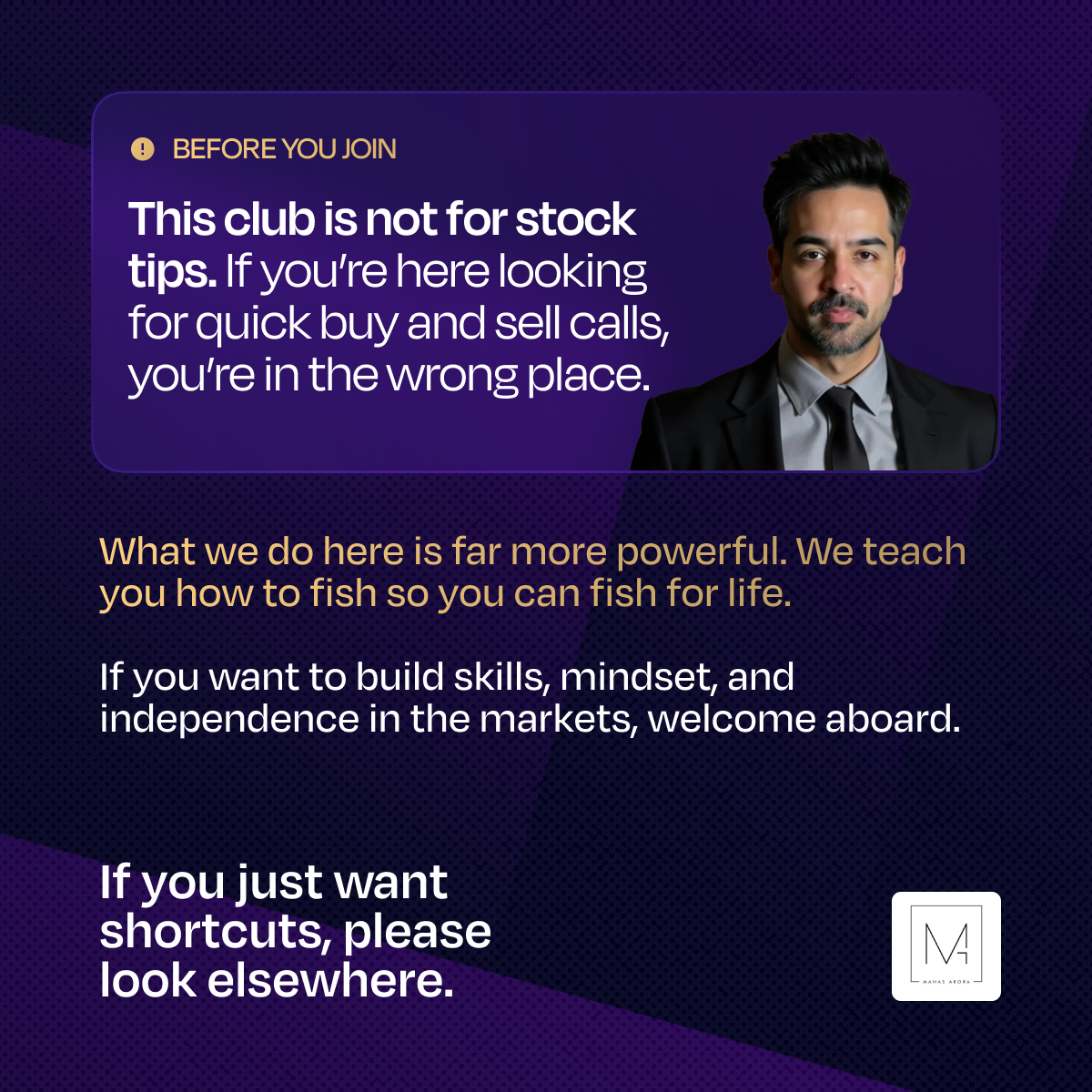 Transform your trading journey with Manas Arora’s Members Club. Gain access to video lessons, monthly webinars, and an engaging platform to connect with fellow traders. This isn’t about chasing tips — it’s about mastering lifelong trading skills. Elevate your mindset, outthink the market, and trade with confidence.