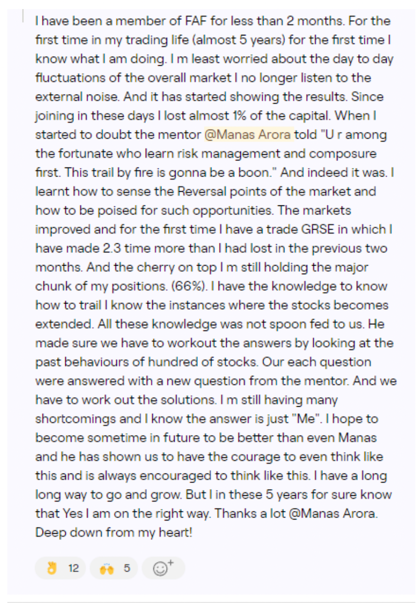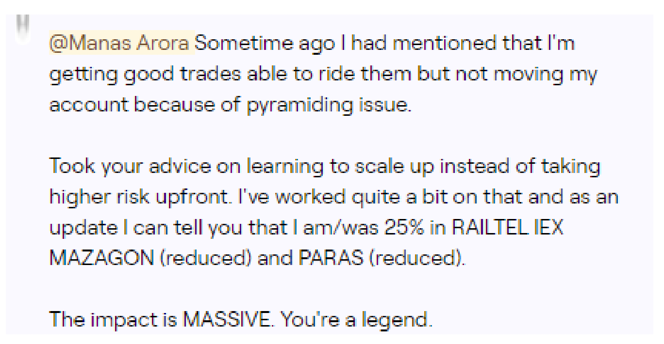 Manas’s investment style revolves around finding low-risk opportunities that offer the potential for asymmetric returns. He has had trades that delivered remarkable returns, such as 1:100, though he stresses that such outcomes are the result of careful strategy and are by no means guaranteed. Above all, Manas believes in helping others become full-time traders while maintaining financial stability by having additional sources of income to cover living expenses.